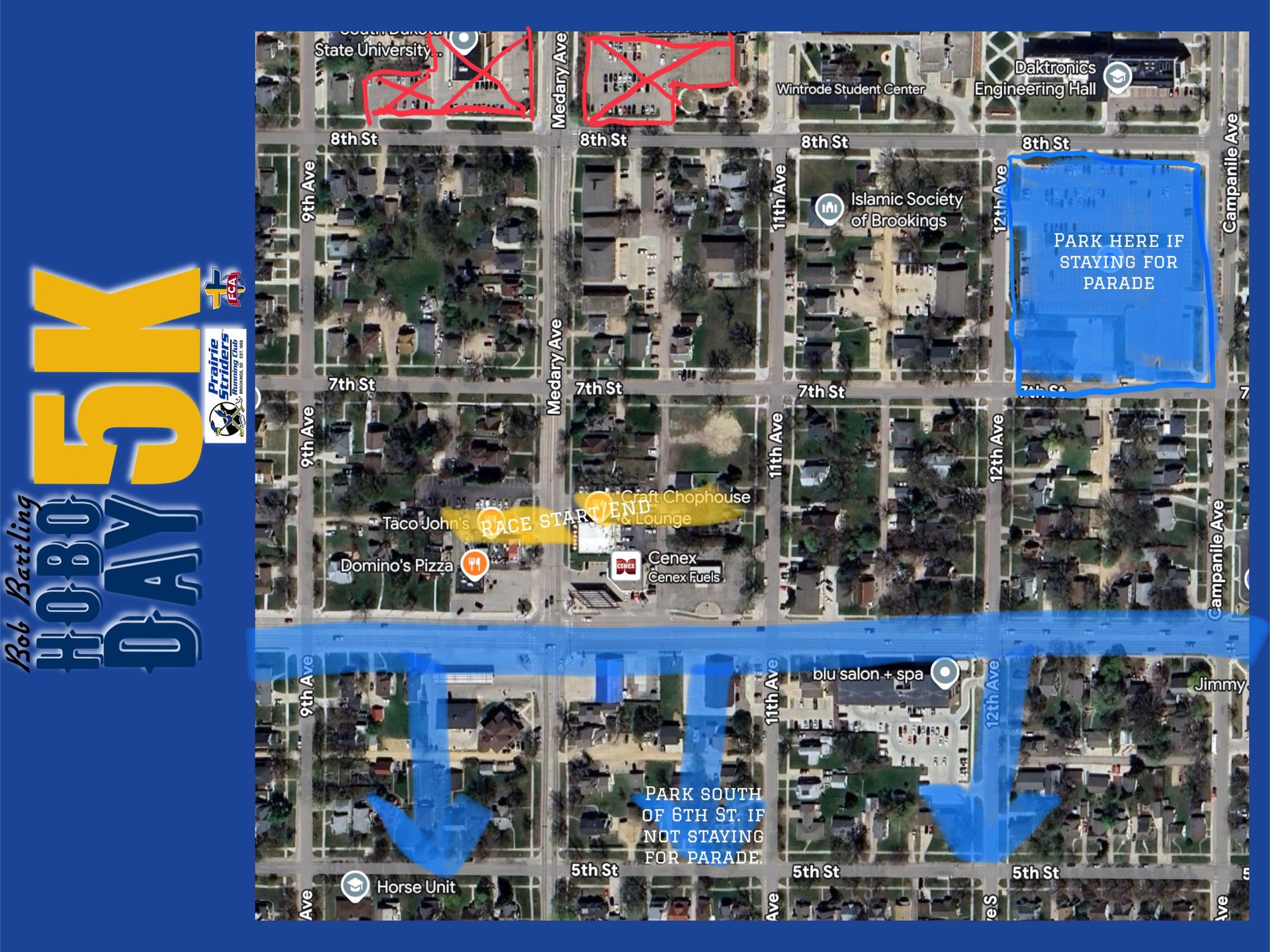 Race Day Parking- if you are not staying for the parade, park south of 6th Street! The roads north of 6th around our start and finish line will be closed in preparation for the parade and til the conclusion of the parade! The only on campus parking lot available will be south of Daktronics Engineering Hall (til full).
